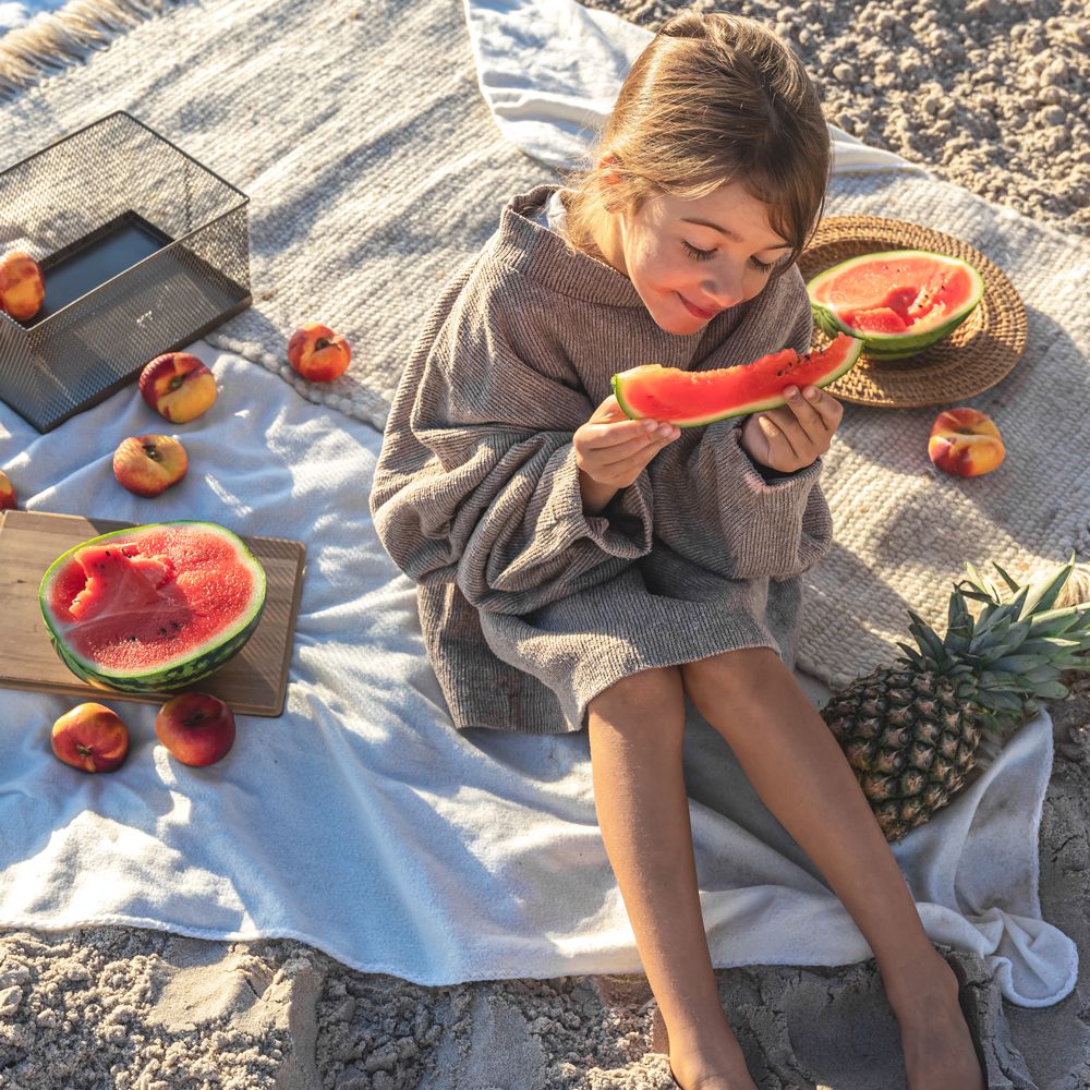 - Frutta fresca: anguria, melone, pesche, albicocche, ciliegie e fragole sono perfette per la spiaggia. Puoi portarle intere o già tagliate a cubetti in un contenitore ermetico. Un consiglio? Il melone cantalupo e l'anguria hanno un'alta percentuale di acqua e potassio, ideali per reintegrare i liquidi persi.